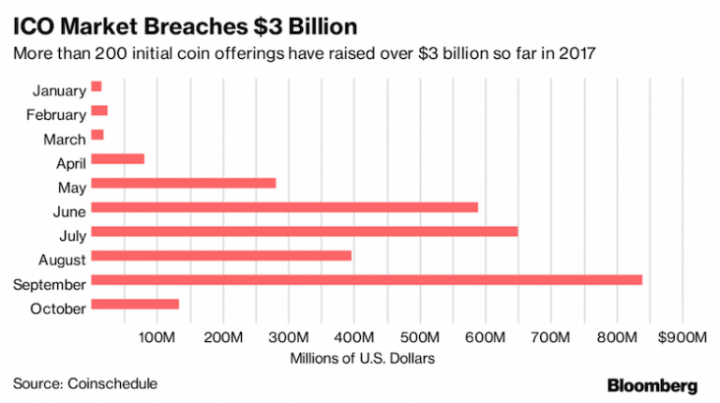 С помощью Initial Coin Offering (ICO) за 9 месяцев 2017 года удалось привлечь около $ 3 млрд, пишет Bloomberg.