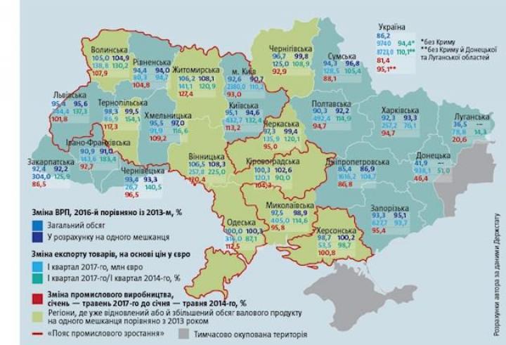 «В стране наметился своеобразный «пояс экономического роста», который на карте обведен красной линией. Вошли в него области, где объем производства в январе-мае 2017 года превысил показатели января-мая 2014, то есть до начала периода полномасштабных боевых действий на Донбассе», — отметил журналист.