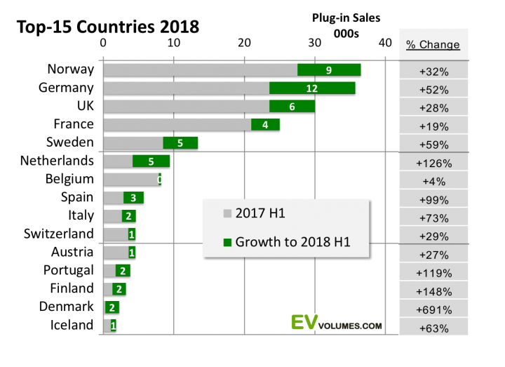 В целом на продажи гибридных и электрических автомобилей выпадает всего 2% от всего количества продаваемых в Европе автомобилей. Лидером по количеству электромобилей остается Норвегия, в которой приобрели 36 500 экологически чистых автомобилей. Германия удерживает вторую позицию и намеревается опередить маленькую Норвегию к концу года. Третью позицию занимает Англия.
