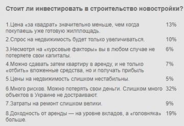 Как демонстрируют результаты опроса, 32% считают, что сегодня в Украине поступать так — большой риск. Слишком много объектов в Украине не достраивают. Некоторые даже предлагают искать варианты вложений за пределами Украины. И не обязательно в недвижимость.