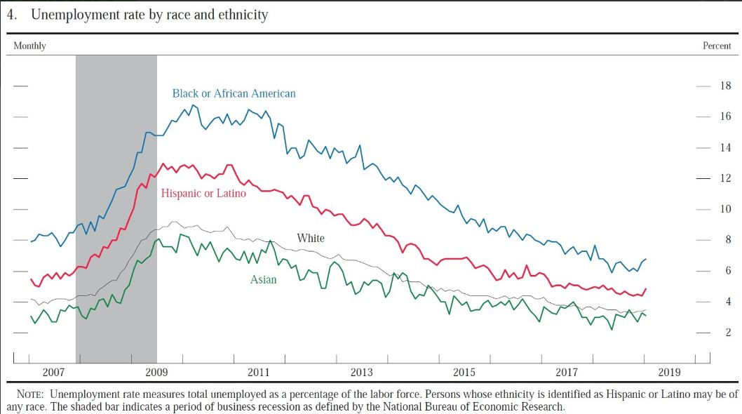 В своем докладе Пауэлл также отметил региональную и расовую неоднородность восстановления американской экономики с момента финансового кризиса 2008 г., указав на различную динамику безработицы в крупных городах и сельских регионах США, а также среди разных этнических групп американского населения.