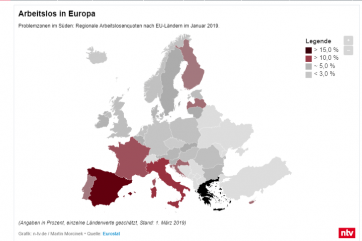 Несмотря на снижение среднего значения безработицы в ЕС, ее уровень характеризуется сильными различиями в региональном разрезе. Например, во Франции – второй по величине экономике Европы – уровень безработицы чуть ниже 9%. В Италии, экономика которой находится на третьем месте – чуть более 10%. В Испании – более 14% трудоспособного населения не имеют постоянного дохода.