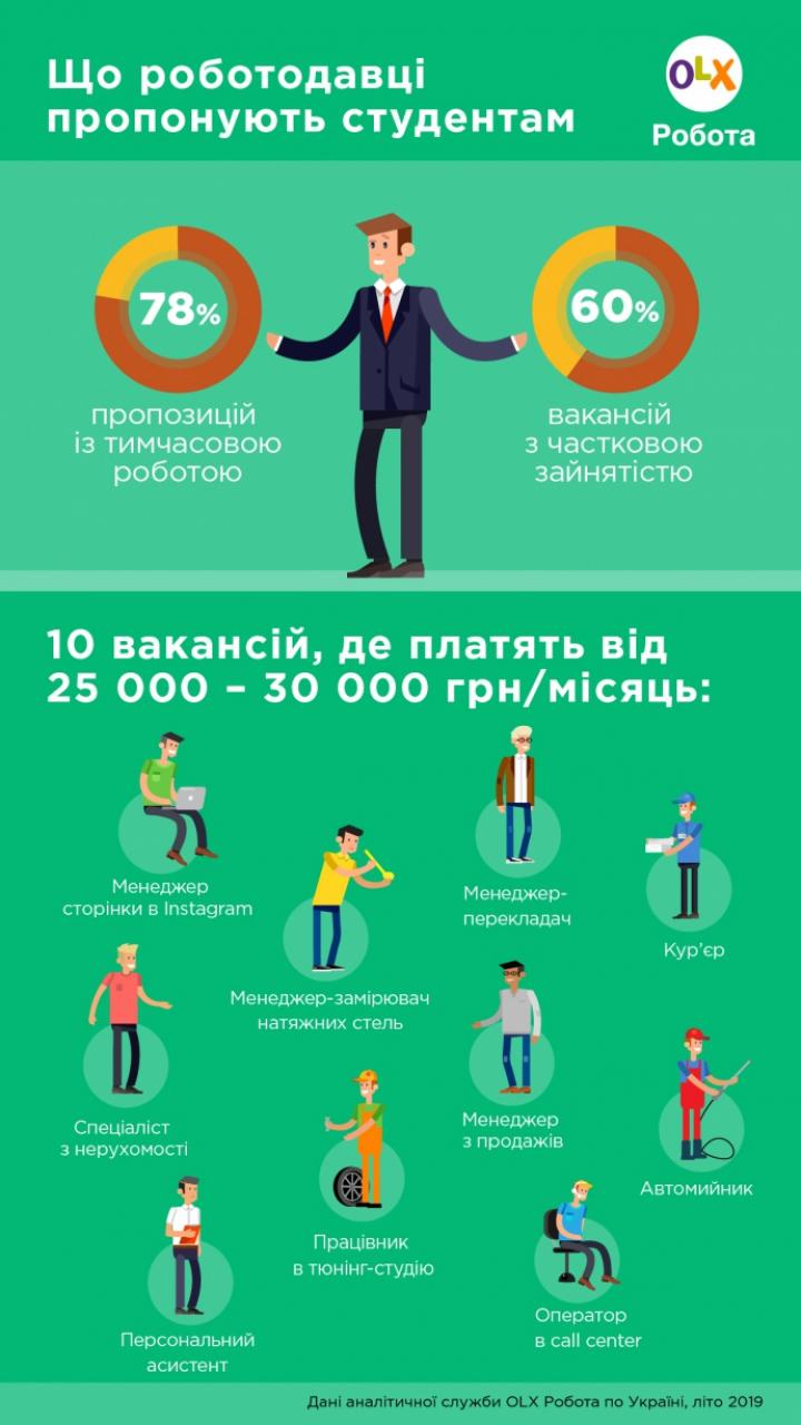 “Молодое поколение предпочитает не только проводить большую часть своего времени онлайн, а и работать там. Работа в Интернете (например, администратор сайта, страницы в социальной сети) лидирует по количеству отзывов от студентов, 57%. Больше всего в этих вакансиях предлагали 13 тысяч гривен/месяц, меньше всего – 7 тысяч гривен. Еще 22% объявлений, по которым активно обращались студенты, предусматривали работу промоутером. Здесь предлагали ежедневную оплату труда в диапазоне от 400-800 грн”, – отмечают авторы исследования.