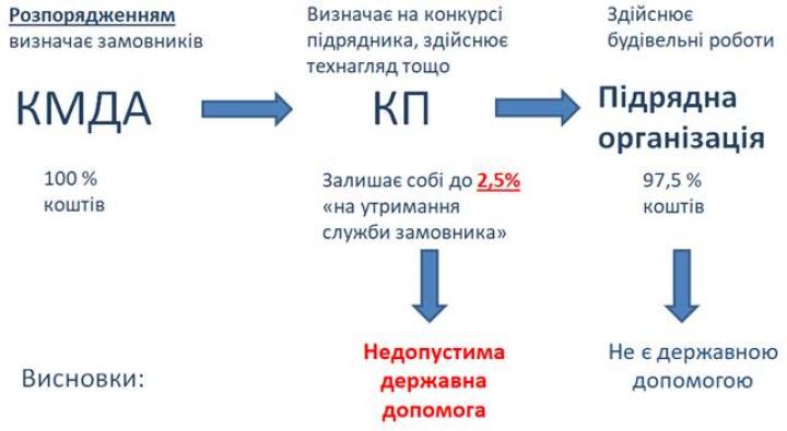 Коммунальные предприятия (КП) Киева «Спецжилфонд», «Инженерный центр», «Житлоинвестбуд-УКБ» и «Житло-сервис» должны вернуть городу 35 млн грн, которые эти КП с согласия городских властей незаконно оставили себе в качестве «содержания службы заказчика». Средства, за которые подрядные организации осуществляют работы, не являются государственной помощью, то есть, никаких угроз строительству и реконструкции нет.