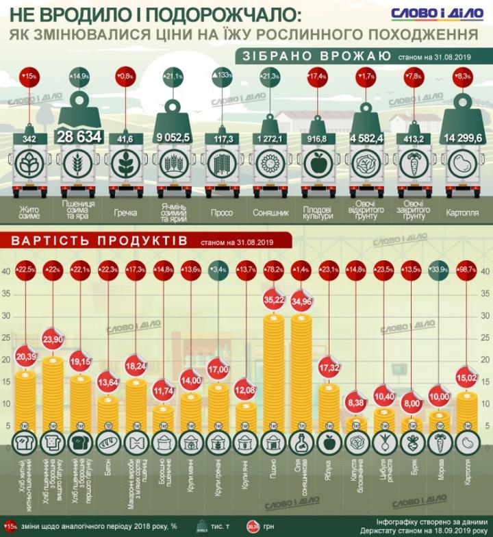 Наихудшая ситуация с картофелем и плодовыми культурами. По данным Госстата, цена на картофель подскочила почти в два раза (на 98,7%), так как урожай в этом году меньше на 8,3%. В магазинах овощ подорожал, и его стоимость стартует от 20 грн за 1 кг.
