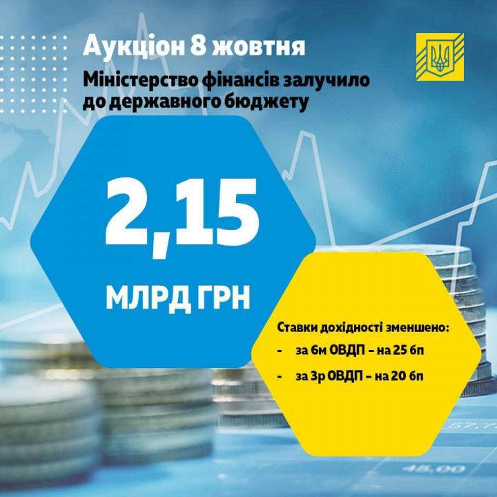 Министерство финансов Украины на плановом аукционе по размещению облигаций внутреннего государственного займа (ОВГЗ) привлекло в госбюджет 2,154 млрд грн.