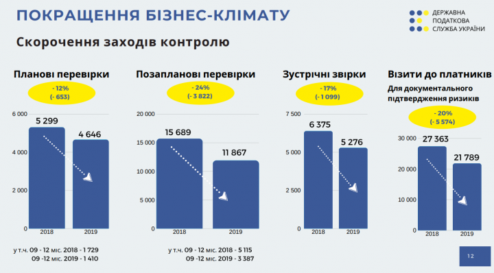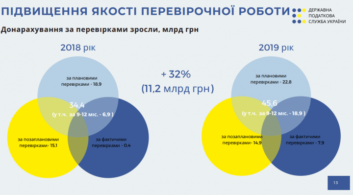 Государственная налоговая служба Украины по итогам проведенных в 2019 году проверок налогоплательщиков доначислила к уплате в бюджет 45,6 миллиарда гривен налогов и сборов, что на 32,6%, или на 11,2 миллиарда гривен больше, чем в 2018 году.