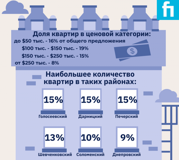 Наименьшая доля представленных к продаже квартир: в Оболонском, Святошинском и Подольском районах – по 6%, в Деснянском – 5%.