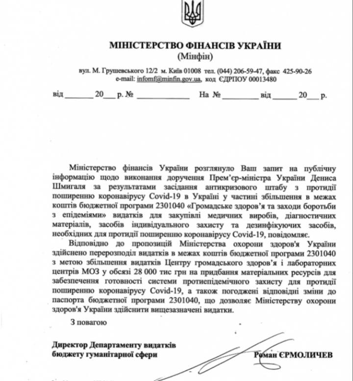Министерство финансов перераспределило расходы на приобретение материальных ресурсов для противодействия распространению коронавируса Covid-19 в сумме 28 млн гривен.
