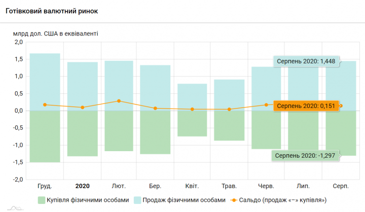 В августе этого года украинцы продали через банковскую систему наличными $  1,448 млрд в эквиваленте, а купили – $  1,297 млрд, следует из данных Нацбанка.