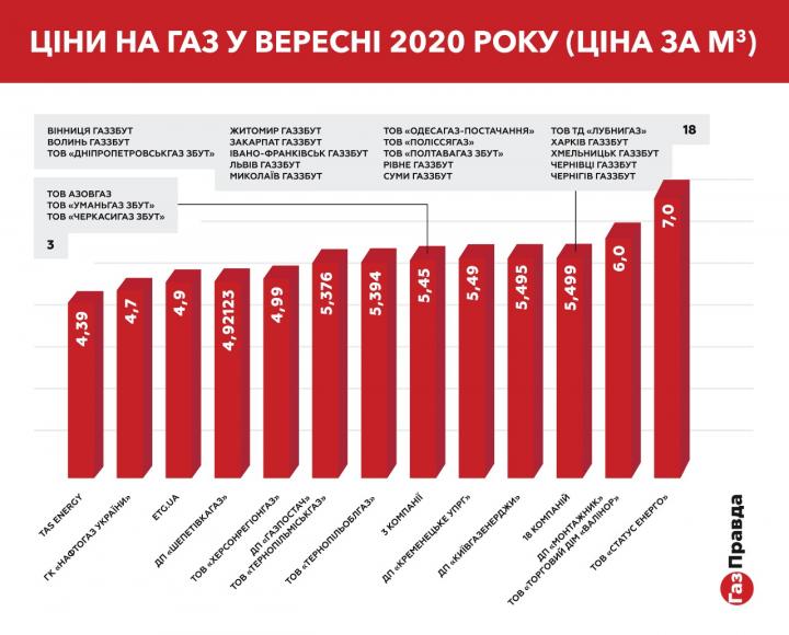 Самую низкую цену за кубометр природного газа населению в сентябре, как и в августе, предложила компания TAS Energy – 4,39 грн за кубометр, что на 1,72 грн выше ее предложения в предыдущем месяце.