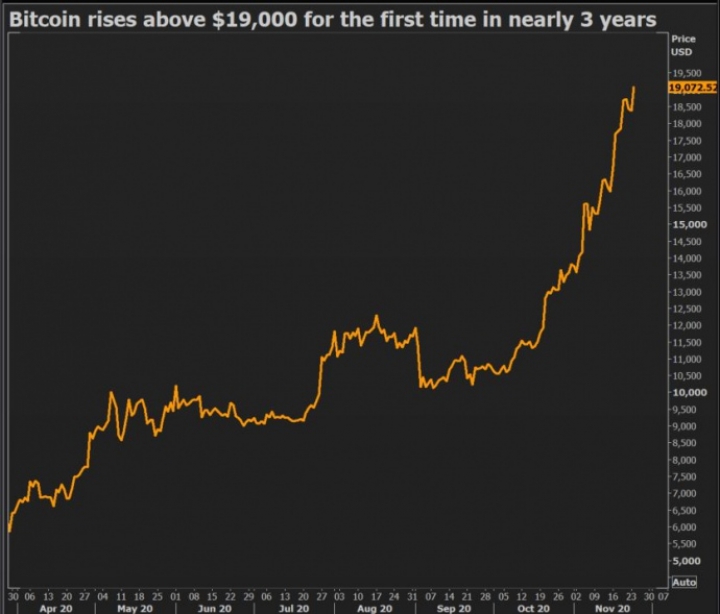 Мировая экономика. Стоимость Bitcoin достигла отметки в $19 тысяч 24 ноября 2020, впервые за 3 года