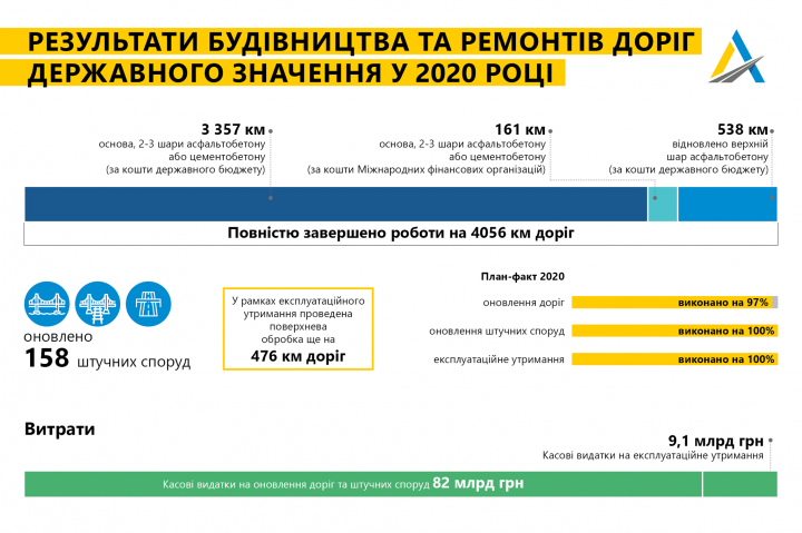 «Всего в верхних слоях построено и отремонтировано 4 056 км дорог, обновлены 158 искусственных сооружений, а также в рамках эксплуатационного содержания проведена поверхностная обработка еще на 476 км дорог», — сообщает Укравтодор.