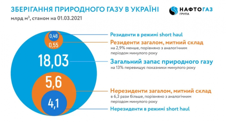 По состоянию на 1 марта в украинских ПХГ хранится более 18 млрд кубометров газа — это на 13% превышает показатель 2020 года.