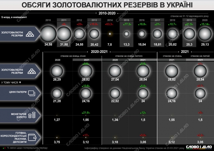 В конце января 2020 года золотовалютные резервы Украины достигли 26,29 млрд долларов, в конце января 2021 года они были на уровне 28,82 млрд долларов (9,6% по сравнению с предыдущим годом).