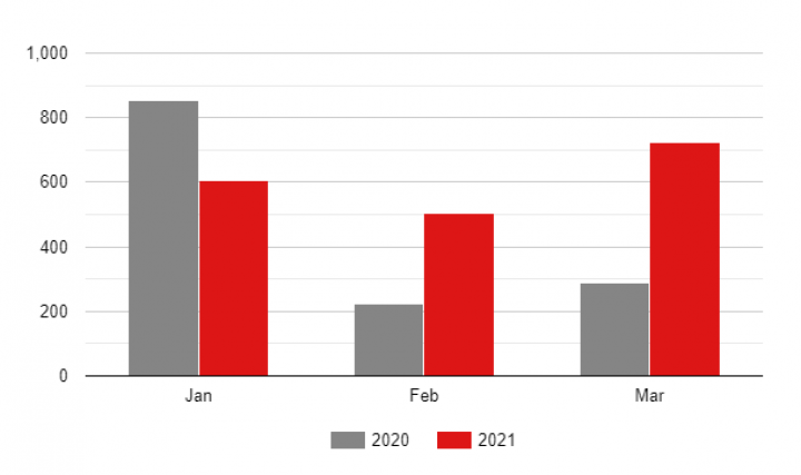 В марте 2021 года предприятия украинского автопрома выпустили 722 единицы автотранспортных средств — это в 2,5 раза больше по сравнению с мартом прошлого года и на 43,5% больше относительно февраля 2021 года.