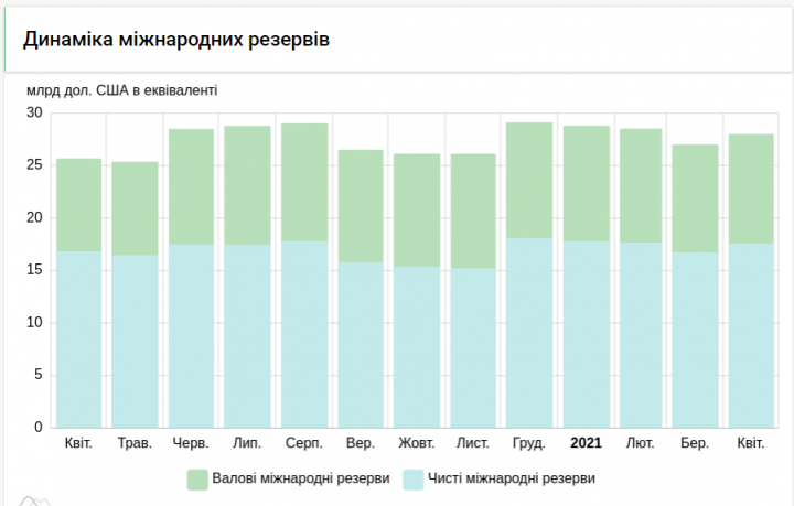 По состоянию на 1 мая 2021 года международные резервы Украины по предварительным данным составили 28 000,1 млн долл. США (в эквиваленте). В апреле они выросли на 3,6% за счет валютных поступлений в пользу правительства и переоценки финансовых инструментов.