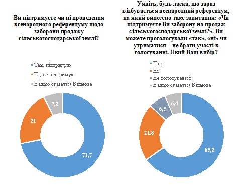 «В случае проведения референдума, на который будет вынесен вопрос „поддерживаете Ли Вы запрет на продажу сельскохозяйственной земли?“ 65,2% респондентов проголосовали бы „за“, а 21,8% проголосовали бы „против“. Еще 6,5% не приняли бы участия в голосовании, а 6,4% не определились или отказались отвечать. Таким образом, среди респондентов, которые приняли бы участие в голосовании, 74,9% поддержали бы запрет», — говорится в сообщении.