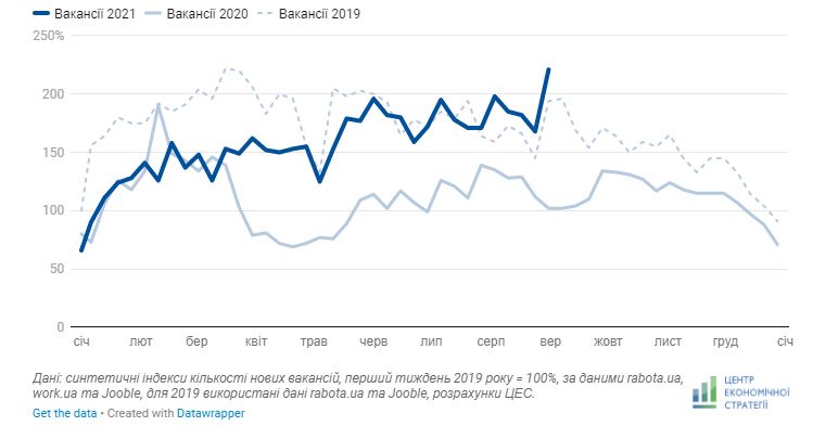 «Количество открытых вакансий за последнюю неделю значительно выросло (+32%) и является наибольшим с начала года. В аналогичный период в 2019 году предложение на рынке труда также увеличилось, но тогда вакансий было на 13% меньше», — отмечено в исследовании.