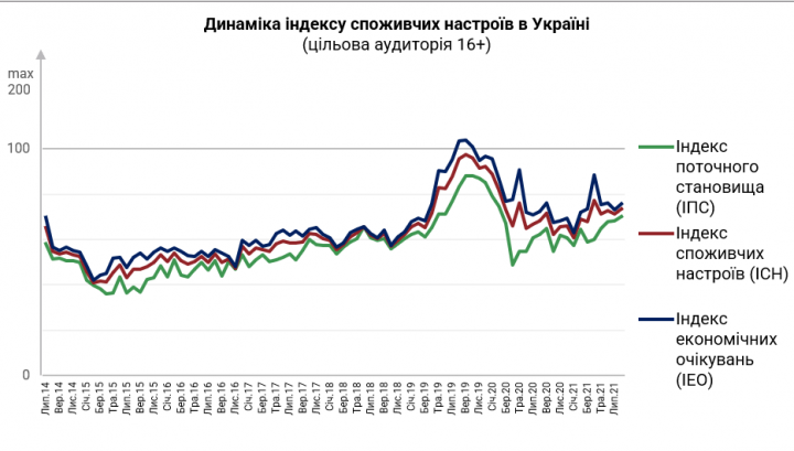 Индекс потребительских настроений в Украине в августе 2021 года составил 73,7, что на 2,4 п. выше показателя июля. Незначительный его рост вызван ростом всех индексов, кроме индекса ожидаемого роста экономики страны.