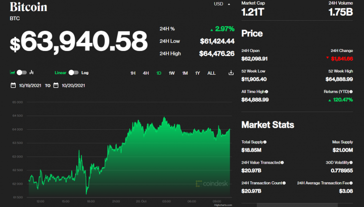 Курс биткоина в ходе торгов 20 октября приблизился к следующей психологически важной отметке 65 тысяч долларов, следует из данных CoinDesk и CoinMarketCap. Так дорого криптовалюта не стоила с апреля 2021 года, когда был установлен пока действующий абсолютный рекорд ($ 64 888,99).