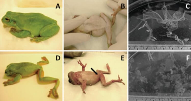 Во втором ряду показана лягушка, зараженная хитридиомикозом