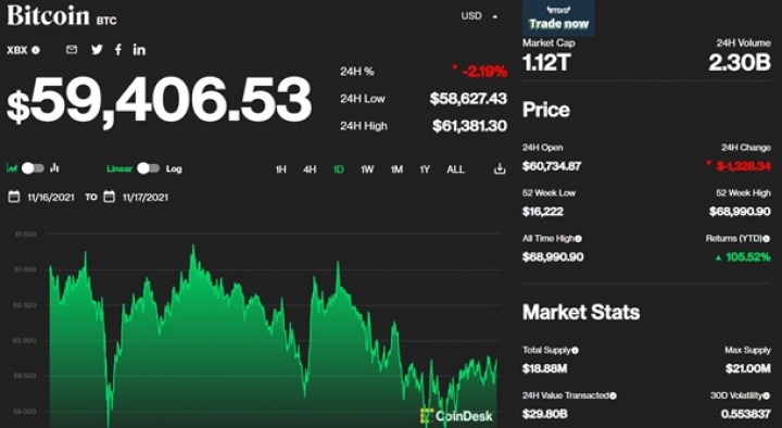 Стоимость криптовалюты Bitcoin упала ниже $60 тысяч 17 ноября 2021