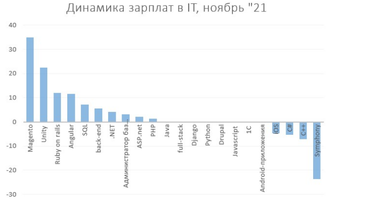 Лидеры прошлого месяца (программисты C++) – напротив, «подешевели» на 7,14%. Специалистам в этой области начали предлагать на 5 тысяч меньше.