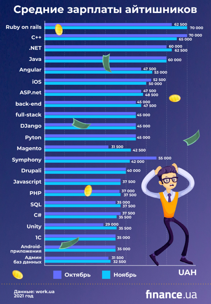 Несмотря на то, что в ноябре средняя заработная плата, которую предлагают работодатели по всем топовым IT-вакансиям, повысилась на 820 гривен, для целого ряда специалистов картина оказалась диаметрально противоположной.