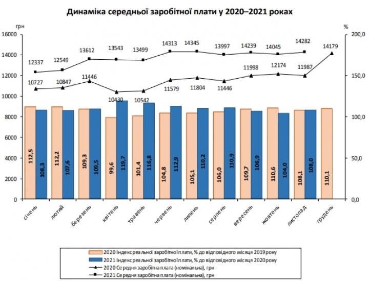 Как свидетельствуют данные Государственной службы статистики, средняя номинальная заработная плата штатного работника предприятий, учреждений и организаций Украины в ноябре 2021 года составила 14 282 гривны.