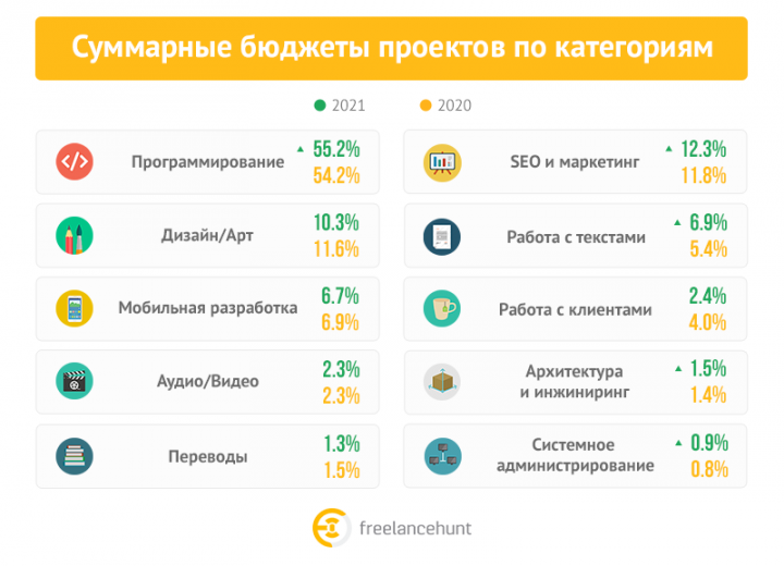 Среди фрилансеров самыми востребованными специалистами по-прежнему остаются программисты. Количество заданий для разработчиков по сравнению с прошлым годом уменьшилось, но бюджеты стали выше. Так, в 2020 году доля проектов в категории «Программирование» — 43,7% от числа всех проектов на сервисе, а в 2021 — 41,8%.