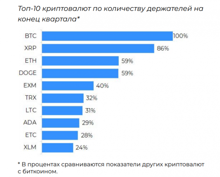 Среди всех криптовалют из листинга Exmo за прошедший квартал больше всего увеличилось количество держателей TON (+239%), Polkadot (+60%) и Robee (+48%). Наиболее заметно сократилось количество держателей Ethereum (-3%), Vitae (-3%) и Bitcoin gold (-3%).