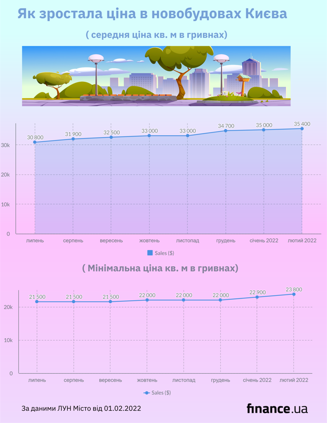 Finance.ua узнал в ЛУН Місто, что по состоянию на 1 февраля 2022 года средняя цена квадратного метра нового жилья в Киеве выросла на 400 грн – до 35 400 грн.
