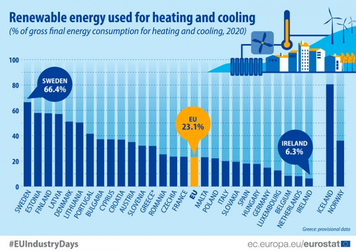 Среди государств-членов выделяется Швеция, где две трети энергии (66 %), используемой для отопления и охлаждения в 2020 году, было получено из возобновляемых источников – в основном из биомассы и тепловых насосов. Эстония и Финляндия (каждая – по 58 %), Латвия (57 %), Дания (51 %) и Литва (50 %) следуют примеру Швеции, где более половины энергии для отопления и кондиционирования поступает из возобновляемых источников.