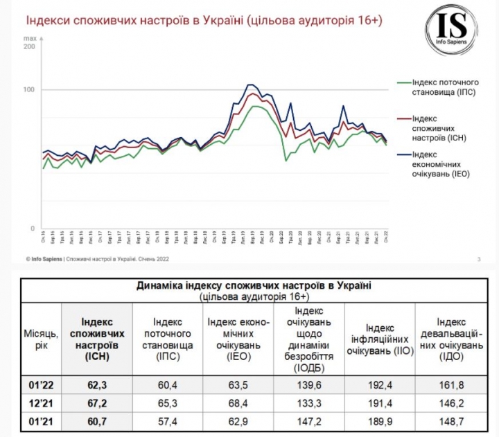 Индекс потребительских настроений в Украине в январе 2022 года составил 62,3, что на 4,9 пунктов ниже показателя декабря. Падение индикатора вызвано снижением всех его составляющих.
