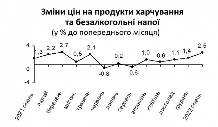 На потребительском рынке в январе цены на продукты питания и безалкогольные напитки выросли на 2,5%. Больше всего (на 21,2%) подорожали овощи. На 3,1-1% выросли цены на фрукты, хлеб, яйца, сыры, рис, мясо и мясопродукты, сметану, рыбу и продукты из рыбы, макаронные изделия. В то же время, на 6,1% и 2,1% подешевели подсолнечное масло и сахар соответственно.