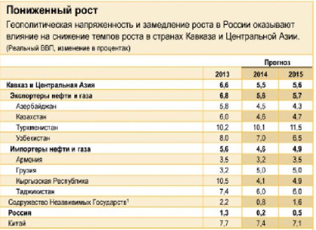Согласно прогнозу МВФ ожидается, что рост в странах-экспортерах нефти, таких как Азербайджан, Казахстан, Туркменистан и Узбекистан, снизится до 5,6% в текущем году по сравнению с 6,8% в 2013 г.
