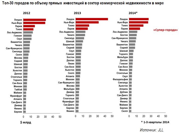Также компания составила рейтинг мировых городов-лидеров по объему сделок. В 2014 году российская столица Москва в состав топ-30 крупнейших инвестиционных рынков не вошла, свидетельствуют данные JLL. В минувшем году Москва заняла только 41-е место, тогда как в 2012 и 2013 годах город располагался на 12-й и 22-й позициях соответственно.