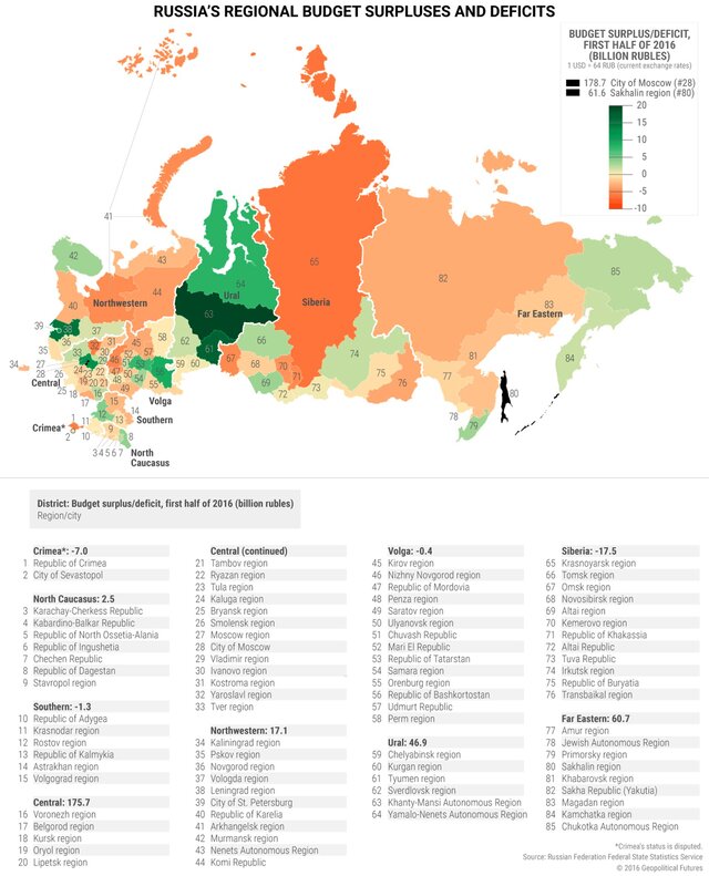 Второй важный аспект – это большое экономическое разнообразие в рамках одной страны. На карте отмечены дефициты и профициты региональных бюджетов по стране.