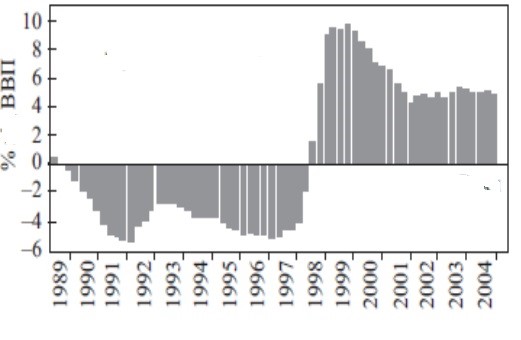 Вернемся к фрактальному подобию, отраженному на рис. 1 и 2. Исследования [2]подтверждают не случайность этого явления. Для стран с развивающимися рынками в периоды переходных процессов, вызванных экономическими, особенно валютно-финансовыми кризисами, такое подобие является закономерностью.