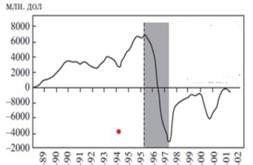 Изменение потоков капиталов, их "внезапная" остановка (рис. 3) коррелирует с изменениями счета текущих операций (CA) платежного баланса (рис. 2), но опережает его. Этот небольшой разрыв во времени определяет кризис и его длительность.