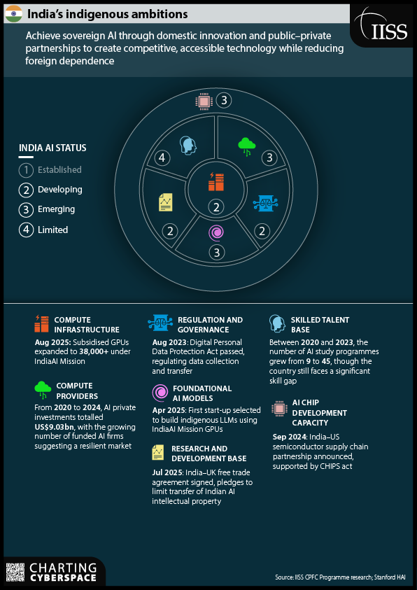 Индийская модель: комплексная индигенизация (самодостаточность). Индия развивает глобально конкурентоспособные внутренние ИИ-компании и внутренние цепочки поставок через механизмы государственно-частного партнерства. Этот подход ориентирован на полное импортозамещение и самодостаточность. Индия активно работает над субсидированием графических процессоров для более чем 38 тыс. субъектов через миссию IndiaAI, а также над разработкой собственных фундаментальных моделей ИИ и чипов, в частности через партнерство с США в сфере полупроводников.