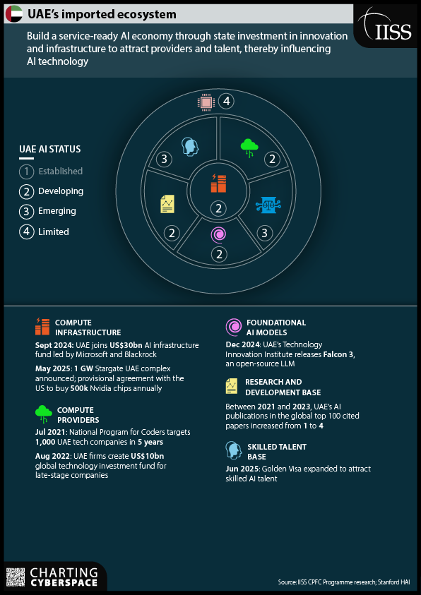 Модель ОАЭ: импортированная экосистема и влияние. Объединенные Арабские Эмираты используют свои значительные финансовые и энергетические ресурсы для создания "service-ready AI economy". Их фокус — это импорт передовых возможностей и влияние на развитие технологии. Это достигается с помощью многомиллиардных инвестиций в глобальную ИИ-инфраструктуру, активного привлечения высококвалифицированных иностранных талантов через программы (такие как Golden Visa) и гарантированного приобретения интегральных схем (планируется 500 тыс. чипов Nvidia ежегодно). ОАЭ также развивают фундаментальные модели, в частности, выпустив open-source LLM Falcon 3, о которой мы писали весной.