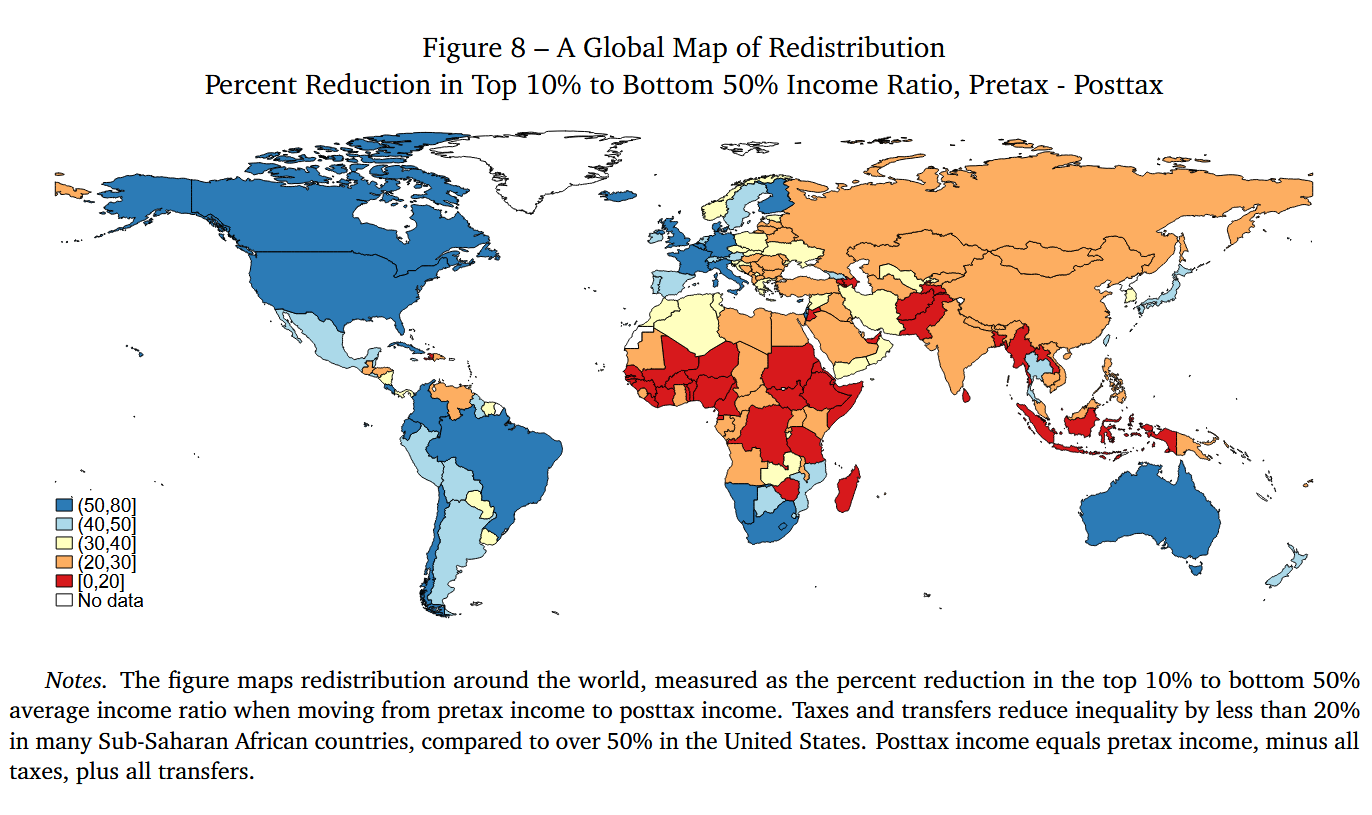 Теперь о самом интересном. Наиболее высокое перераспределение зафиксировано в странах Западной Европы и в англосфере (это прежде всего США), где налоги и трансферты снижают неравенство более чем на 50%. Это связано с большим объемом социальных трансфертов и их более четкой направленностью на домохозяйства с низким уровнем дохода. А самое низкое перераспределение происходит во многих странах Африки к югу от Сахары — менее 20%, где в целом значительно меньшие трансферты.