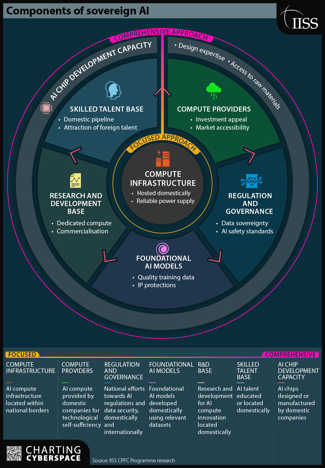 Согласно недавнему анализу Международного института стратегических исследований, государства, исходя из национальных приоритетов и преимуществ, выбирают различные подходы к развертыванию суверенного ИИ, которые можно разделить на сфокусированные (например, приобретение вычислительной инфраструктуры) и комплексные (развитие всех компонентов, в частности регулирования и инновационной исследовательской базы). Аналитики объясняют, как работают различные модели развития суверенного ИИ на примере трех стран.
