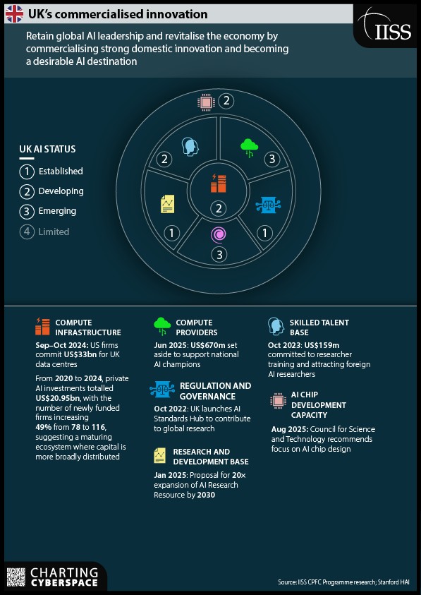 Британская модель: коммерциализация инноваций и регуляторное лидерство. Великобритания стремится сохранить статус глобального ИИ-хаба, делая ставку на коммерциализацию уже сильной отечественной инновационной базы и лидерство в установлении международных стандартов и регулировании. Британский подход сфокусирован на преобразовании собственных исследований (предложение 20-кратного расширения ресурсов R&D до 2030 г.) в глобальные продукты, а также инвестировании в квалифицированные кадры и разработку ИИ-чипов.