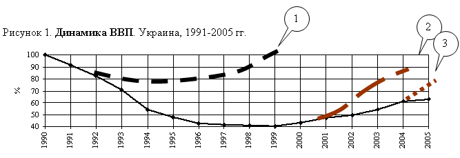 Однако Украина попала в беспрецедентную ситуацию. Во-первых, в экономической истории до сих пор не было подобного случая, чтобы ВВП страны или группы стран упал более чем на 60% в мирное время. У нас в Украине также можно было «обойтись» меньшими потерями, например, хотя бы тридцатью процентами снижения ВВП, тем более, что если учитывать теневую экономику, он таким и был. Первый сценарий развития событий (кривая «1» рис.1) демонстрирует, какой могла быть предполагаемая траектория ВВП. Однако в 1993 году в экономической политике произошло нечто, что резко изменило динамику в худшую сторону. Рассматривая гипотетические сценарии экономической динамики можно заметить, что также «нечто» произошло и в 2002, а также в 2005 годах (кривые «2» и «3» на рис. 1). В итоге восстановление экономического потенциала растянулось во времени.