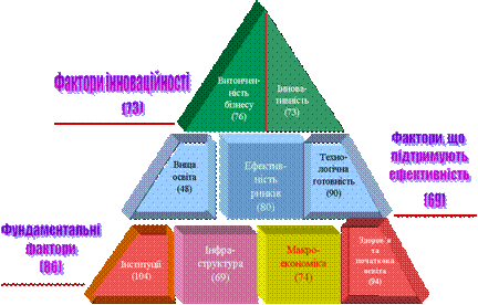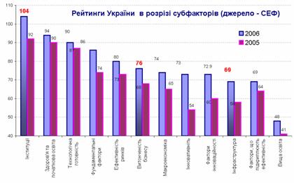 Якщо розглянути складові рейтингу ІГК (рис. „Рейтинги України в розрізі субфакторів ..”), то видно, що серед основних факторів найгірші позиції залишилися за оцінками інституційних складових (більш того відбулося зниження рейтингової позиції з 92-ої на 104-у), оскільки в Україні, на відміну від інших кран, не досягнуто прогресу в поліпшенні інституційного середовища. Разом з тим погіршилися майже усі макроекономічні параметри а також оцінки інноваційності (з 54 на 73 місце).