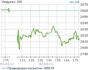 В Среду 02/03/2011 индекс UX, рассчитываемый "Украинской Биржей" по завершению торгов составил -1,54% и снизился до значения в 2 815,86 пункта.