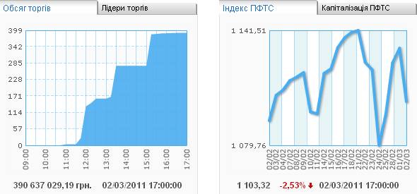 Индекс ПФТС упал на -2,53% и составил 1 103,32 пункта. Объем торгов увеличился постепенно, составив к концу дня – 390,64 млн. грн.